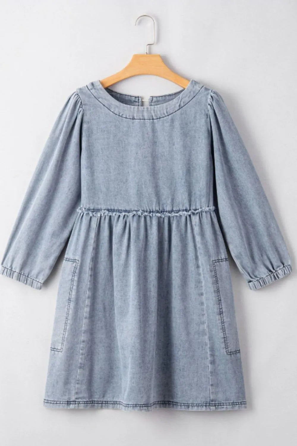 Cutout Round Neck Balloon Sleeve Denim Dress