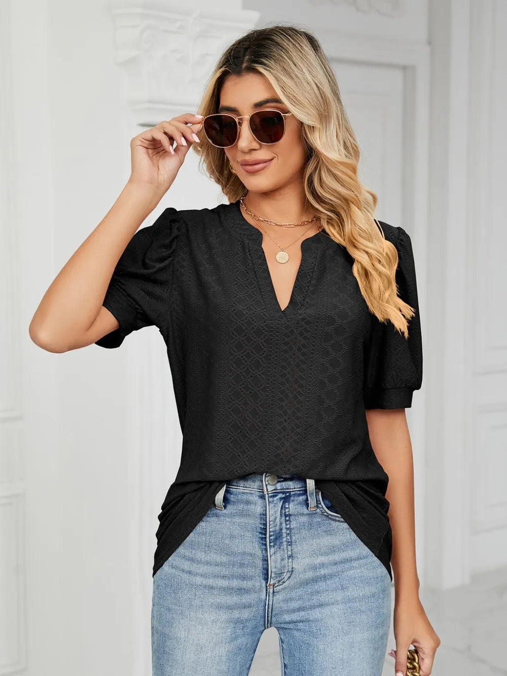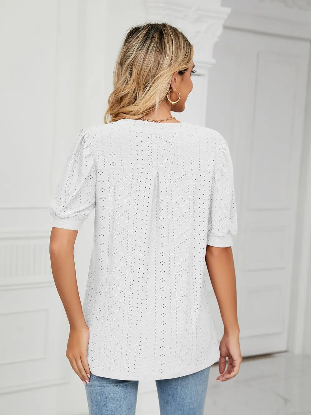 Florira Eyelet Notched Short Sleeve T-Shirt
