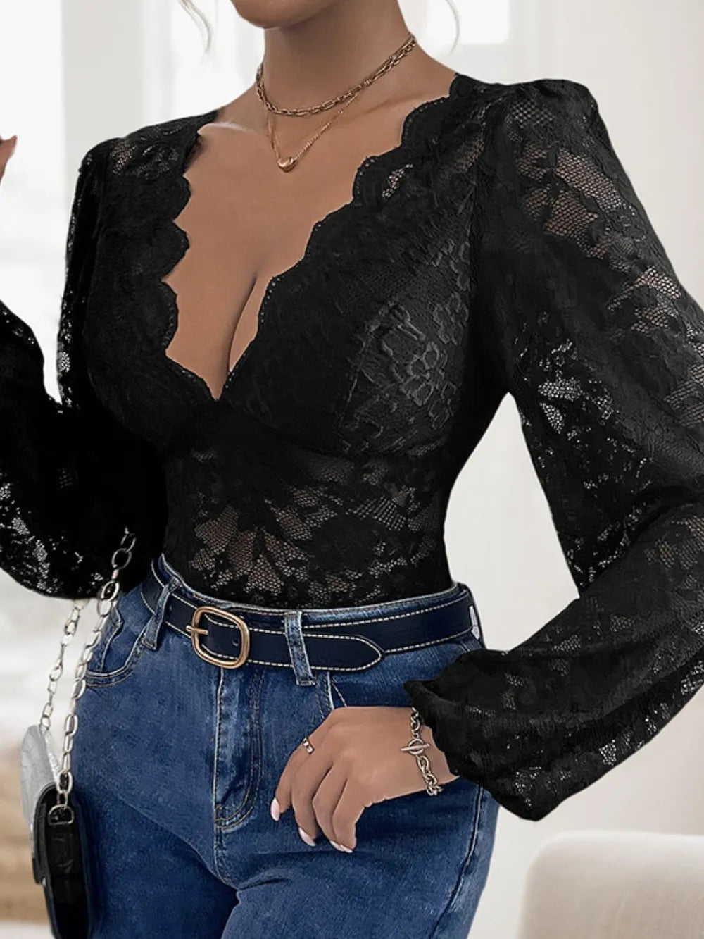Perfee Lace Plunge Long Sleeve Bodysuit