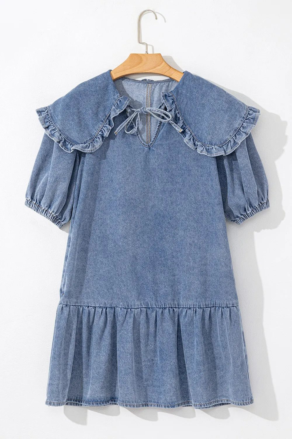 Ruffled Side Pockets Puff Sleeve Denim Mini Dress